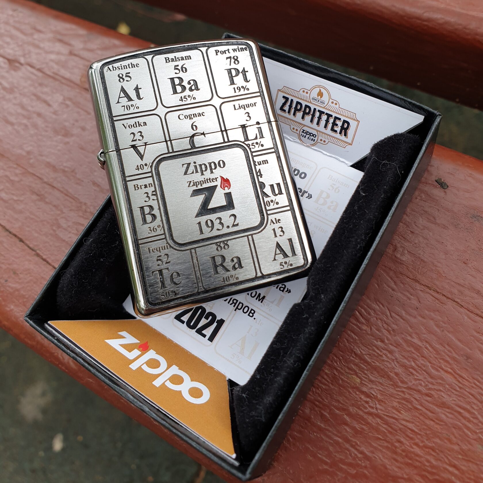 Зажигалки будут поставляться в подарочной коробочке Zippo(родная оригинальная коробочка с тематически оформленным вкладышем также идёт в комплекте), бонусом к каждой зажигалке станет бутылочка с "одноимённым содержимым".
